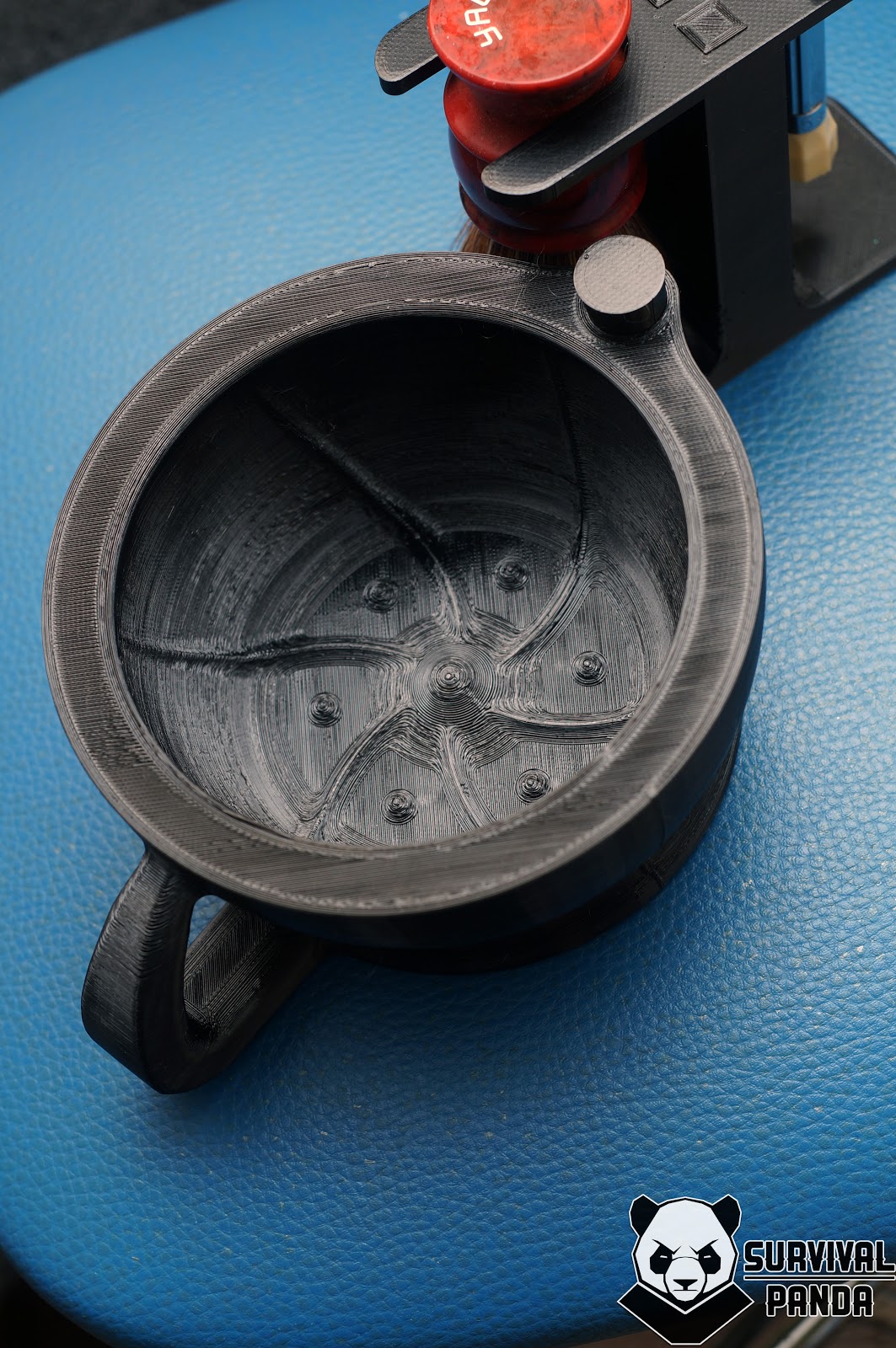А вот вторая модель — скаттл, или чаша для взбивания пены. Причем двустенная. В пространство между стенками заливается горячая вода, благодаря этому пена легче взбивается и подогревается. Это копия чаши — PHOENIX THE CROWN KING. И на мой взгляд копия получилась очень годный.