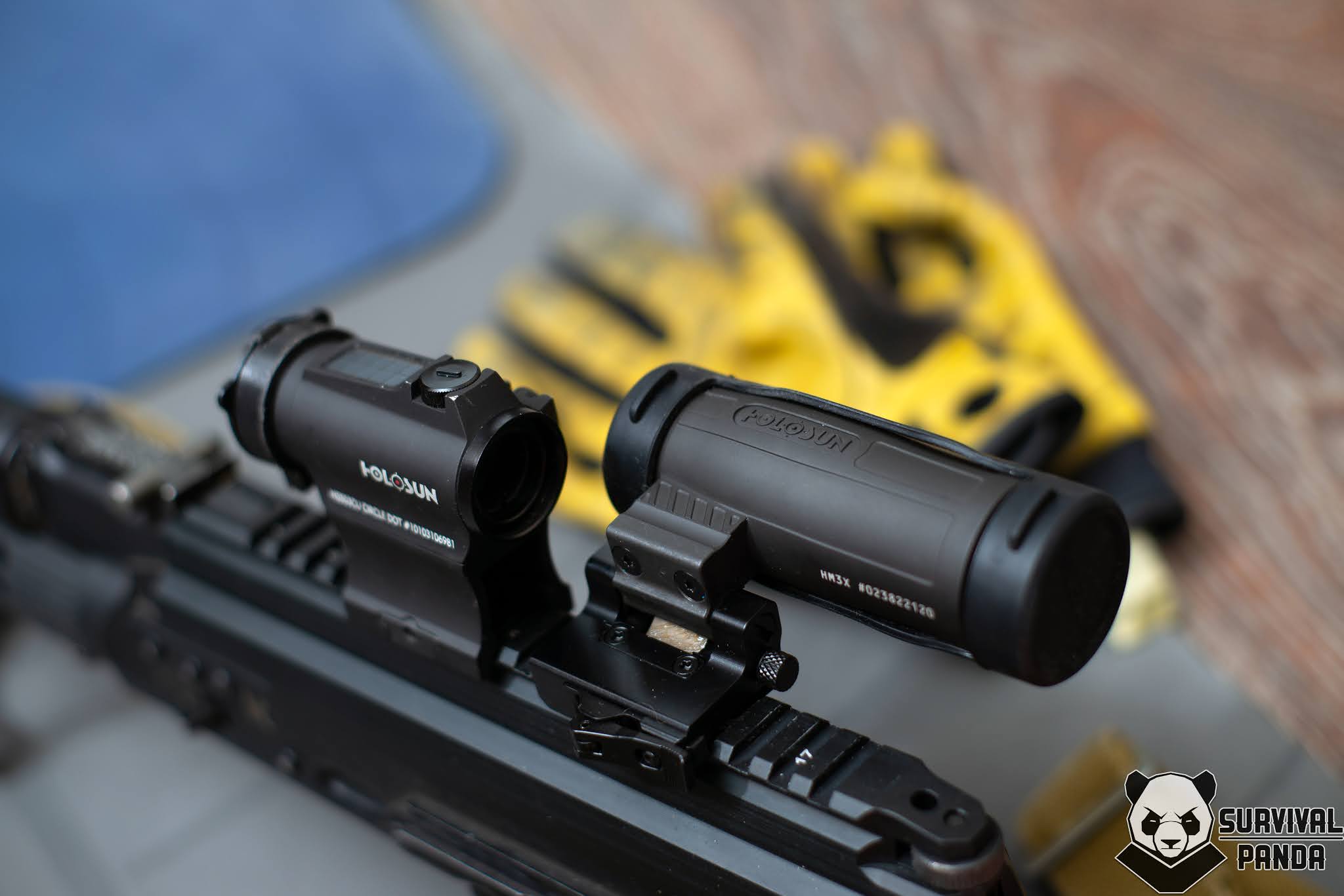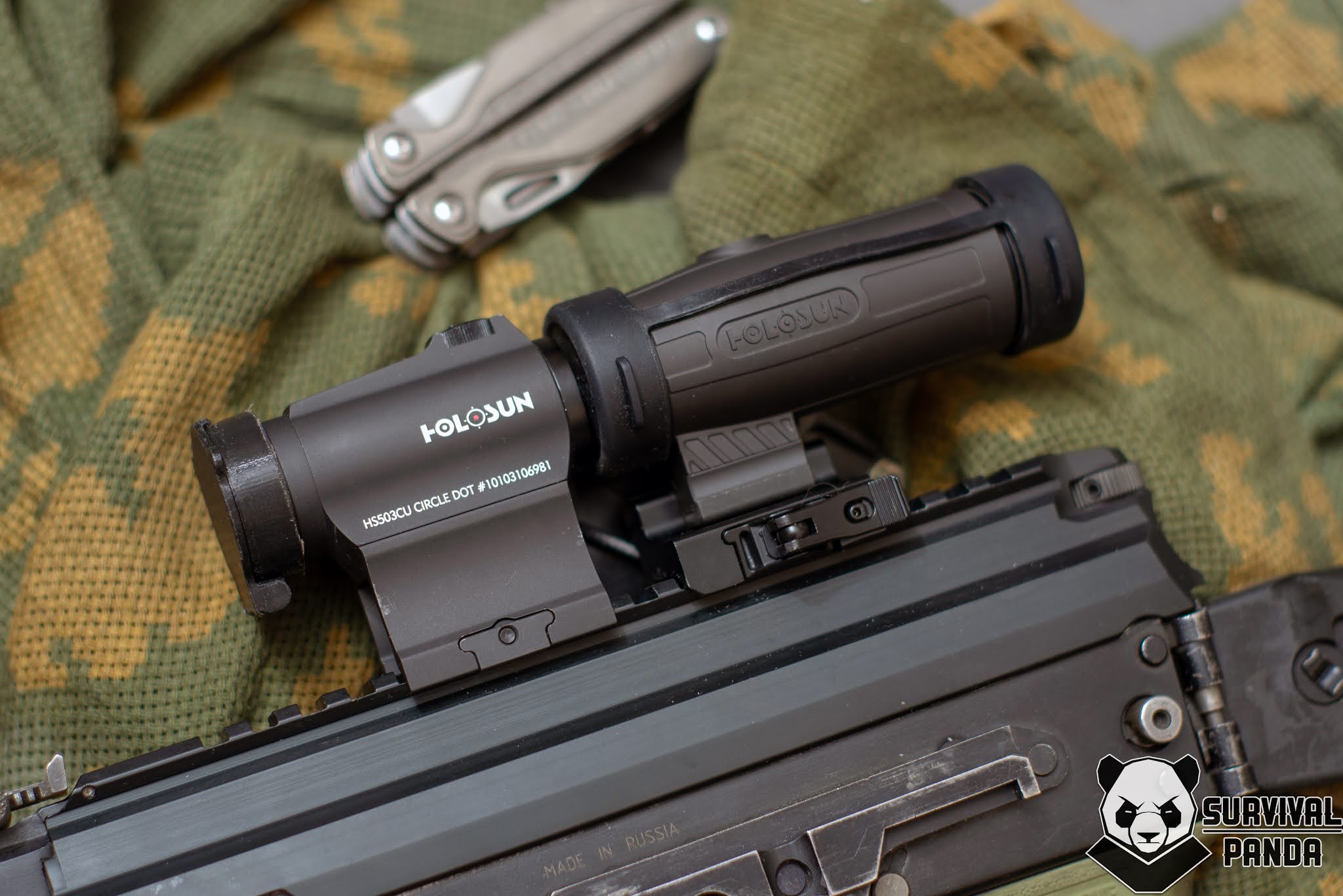 Вот и доехал до меня завершающий элемент апгрейда оптики — холосановский магнифер. В итоге получилась триада в которую, кроме вышеназванного увеличителя, вошла крышка ствольной коробки FAB Defense PDC и коллиматор Holosun 503cu.