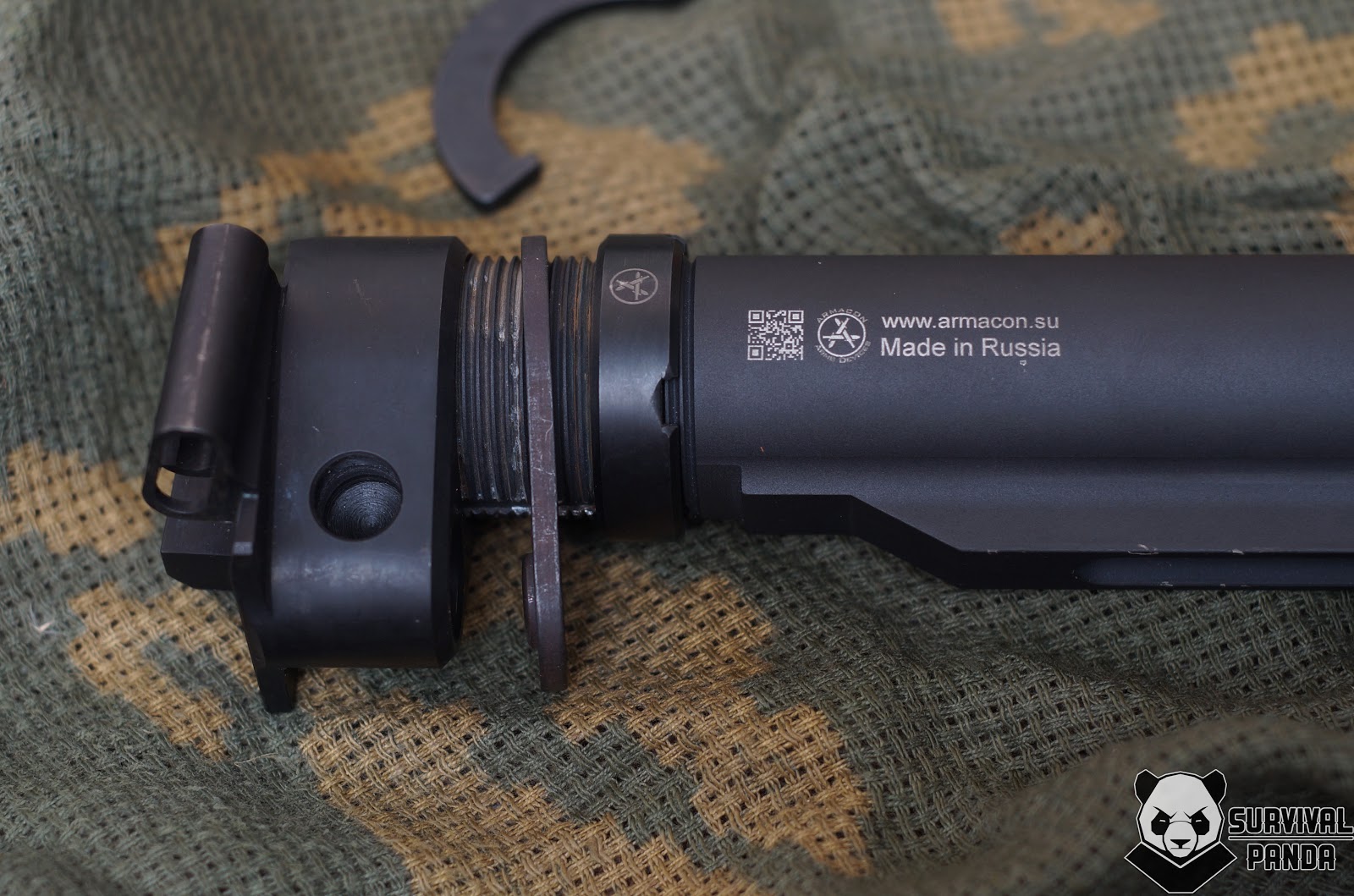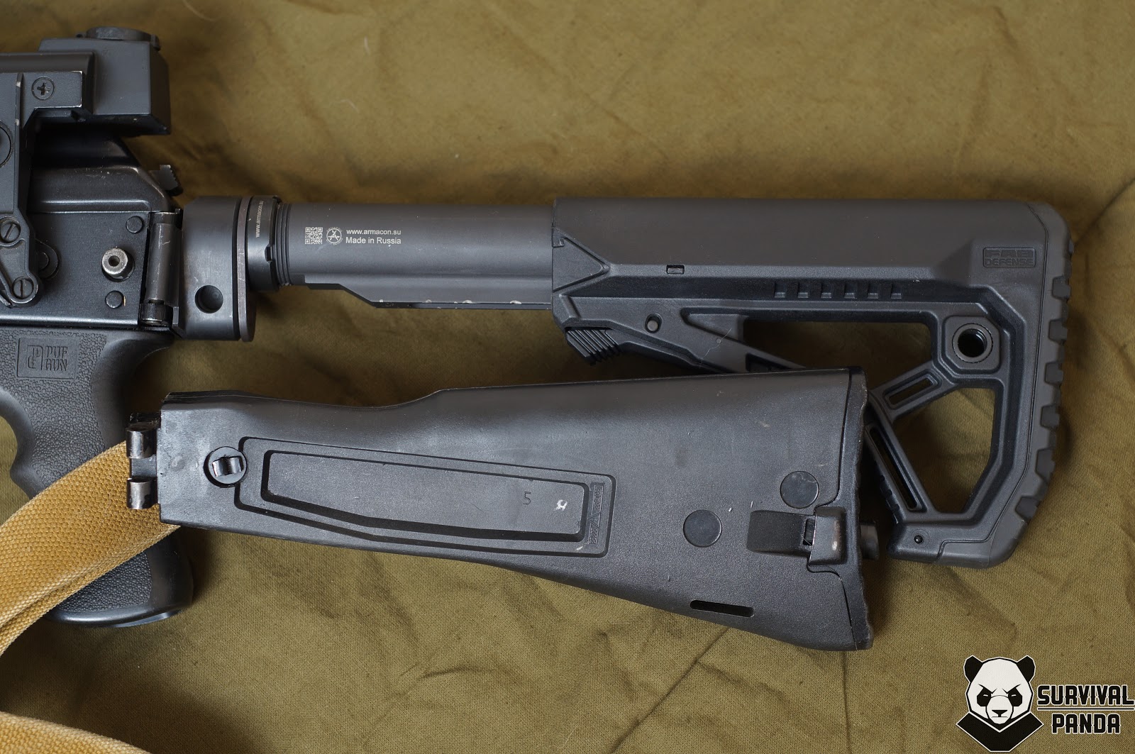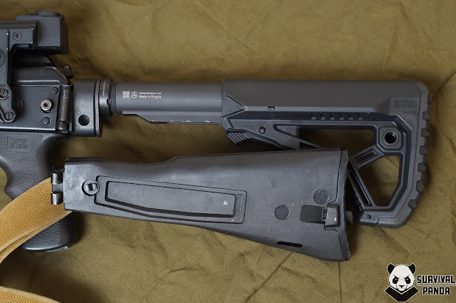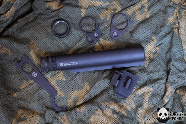 Изготовлена она под коммерческий стандарт прикладов, лично мне больше всего нравятся Magpul CTR и FAB Defense GL CORE.