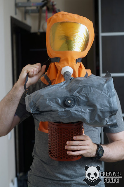 Надевается противогаз, как любой другой. Вдохнули чистого воздуха, подбородок в упор, затем затянули пряжки. Далее проверяем герметичность. Закрыли рукой клапан и пытаемся вдохнуть, если не получается, значит все правильно.